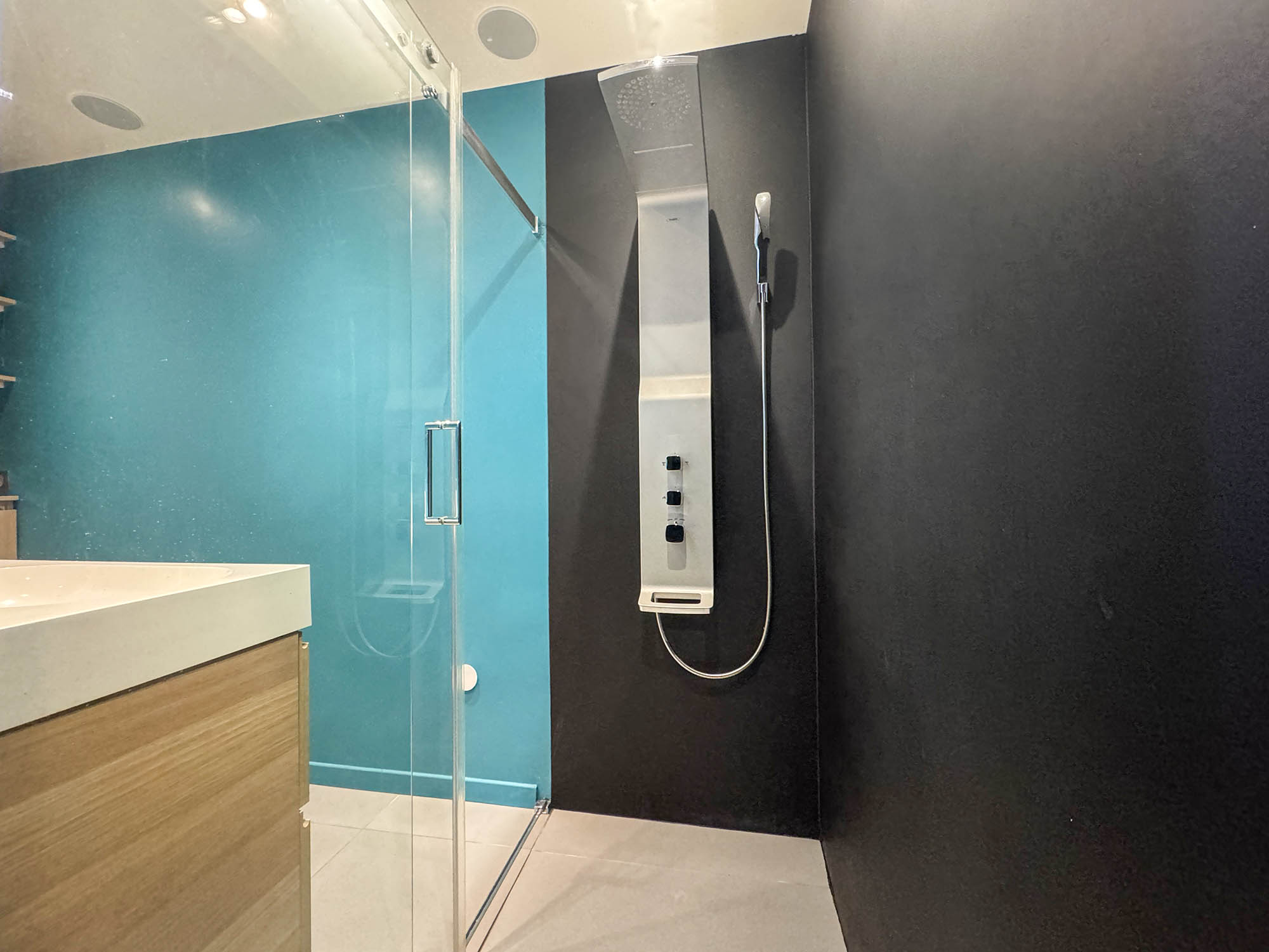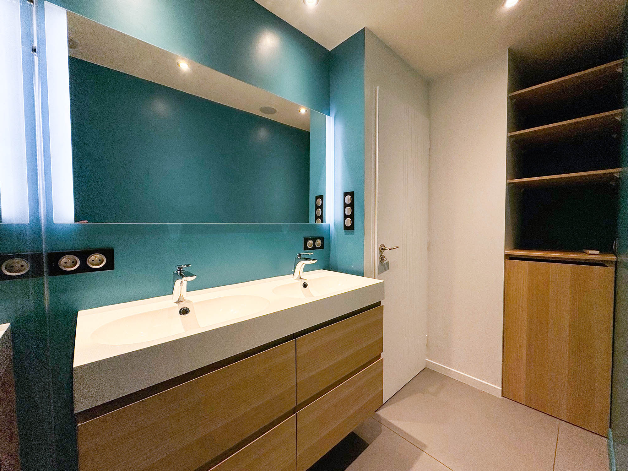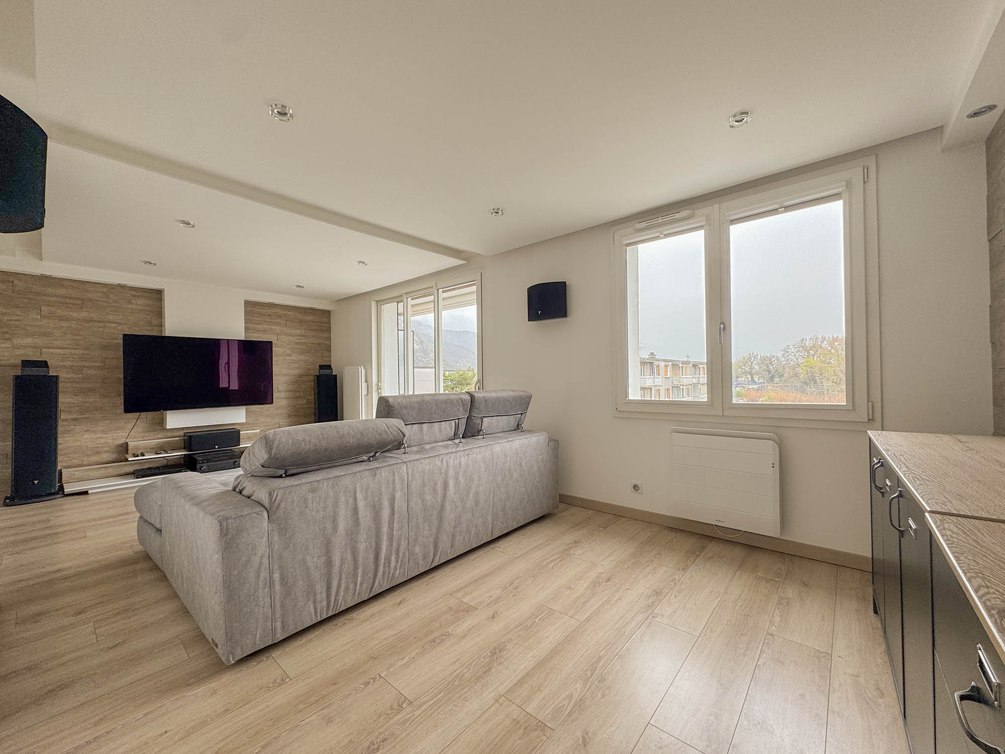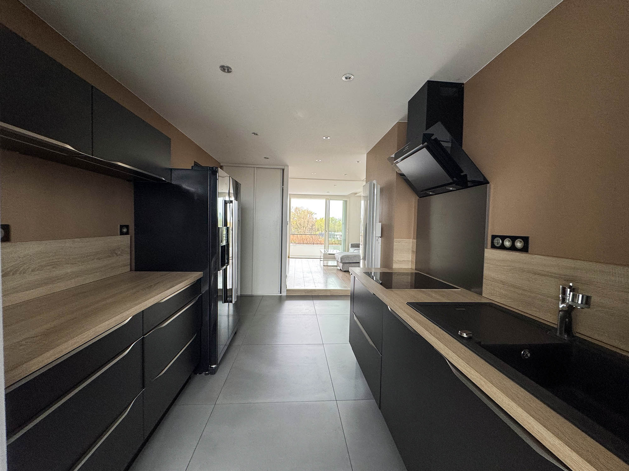 L'ensemble de l'appartement bénéficie de faux plafonds avec spots intégrés, offrant un éclairage moderne et une esthétique épurée dans chaque pièce.