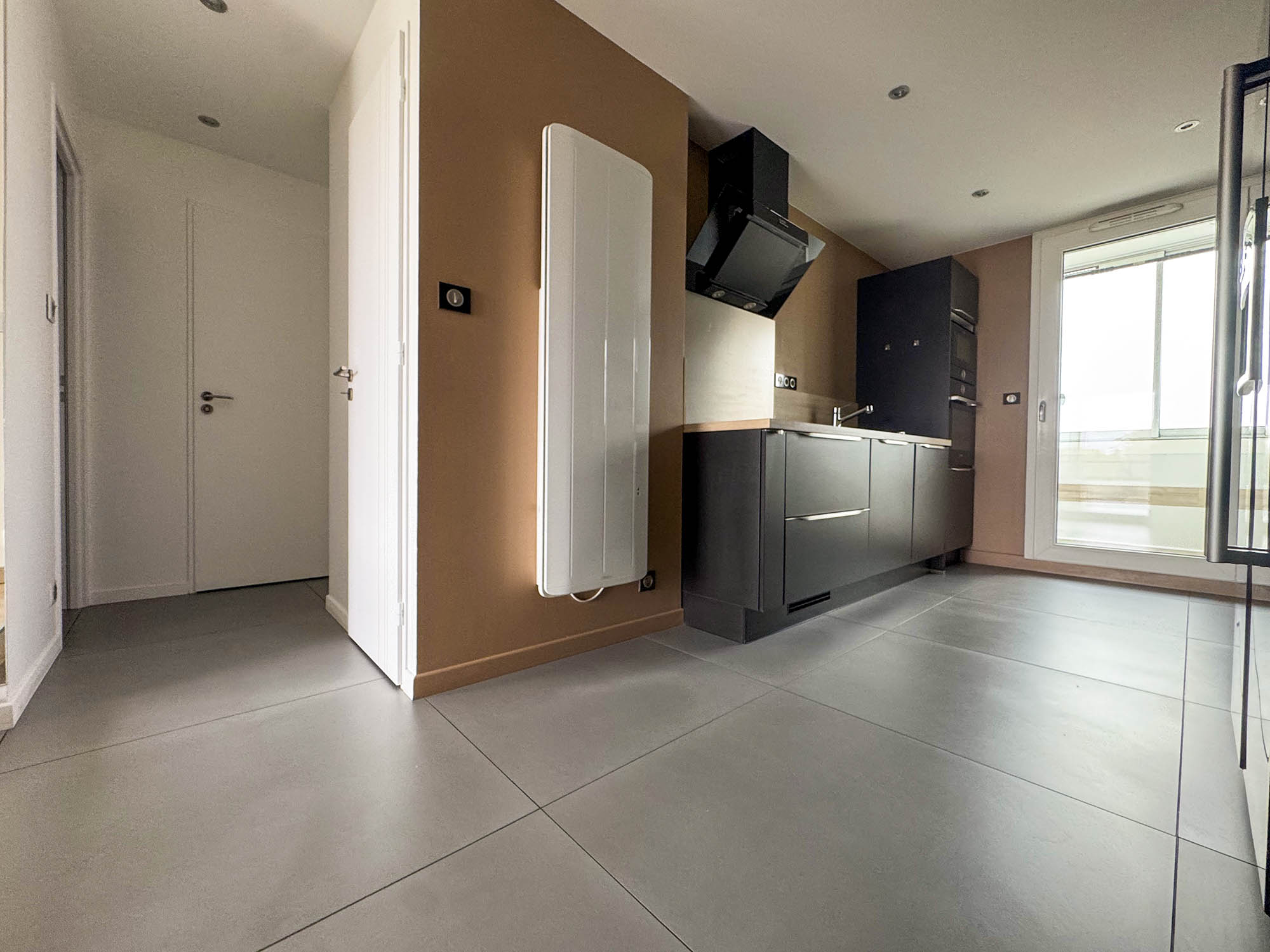 Une cuisine moderne de 13 m², entièrement équipée, prolongée par une loggia fonctionnelle avec rangements.